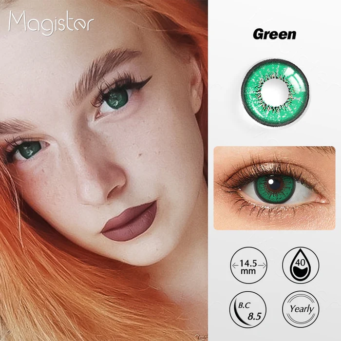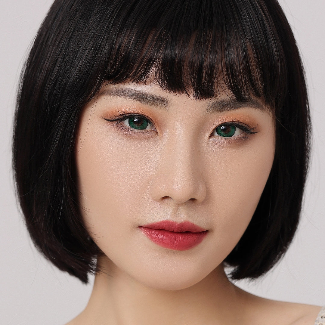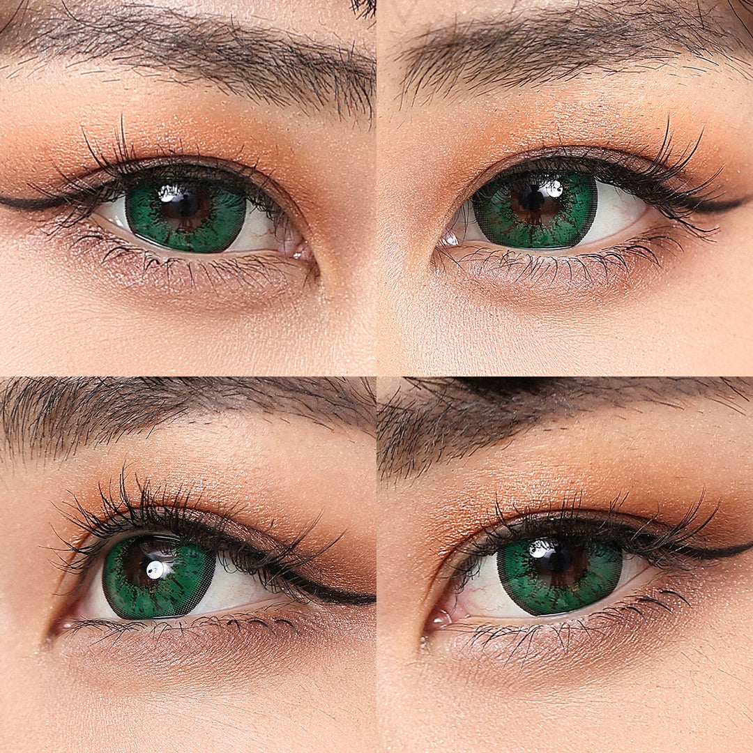 The flame green lenses have a bright green starburst design. It's a bright and beautiful color that gives you a vibrant look and opens up the entire eye area. The black lip ring adds intensity and ensures that you get a truly stunning look.
