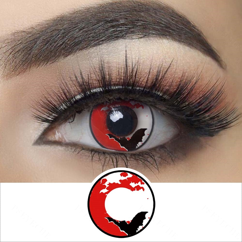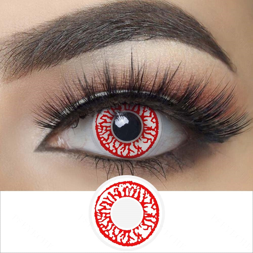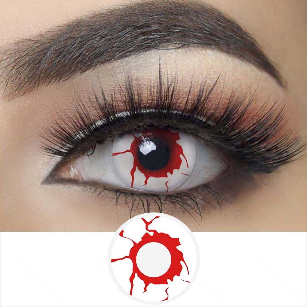 These bloody eye contacts are designed with bright red as main color for horrible tone. The bright red elements are presented in different forms with different supporting colors gives various choices for you. They completely cover up your natural eye color and are ideal for a range of costumes.