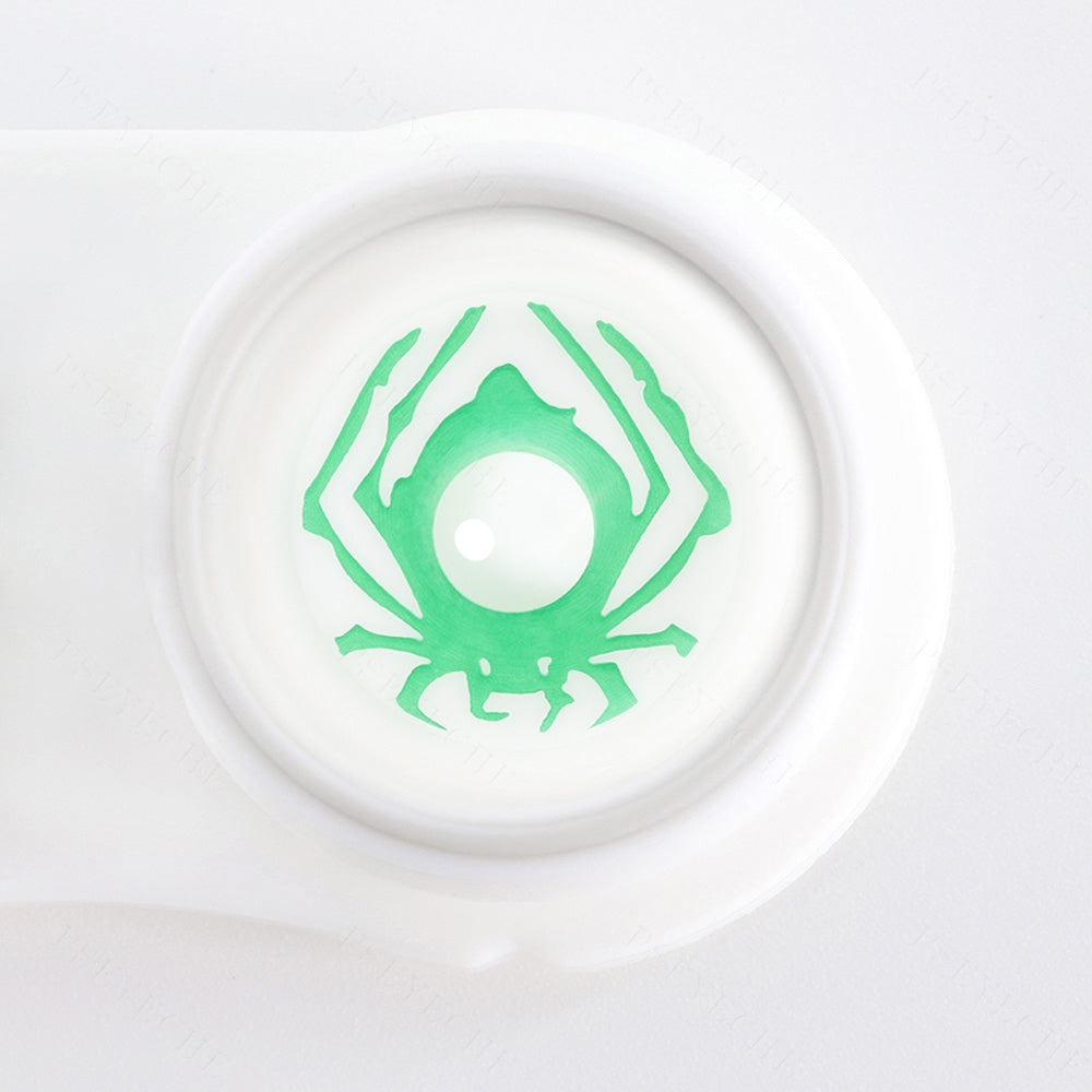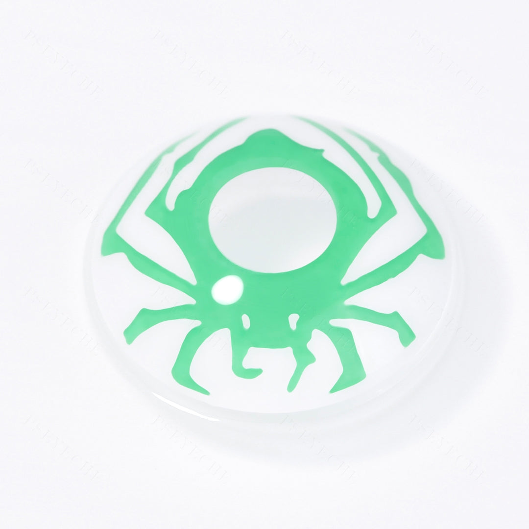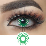 - Green Spider Halloween lenses increase the fun for Gothics and Halloween fans. These contacts are designed with a big green spiderΒ under a white background, creating a freaky look. With these Spider Halloween contacts,Β you canΒ perfectly perform many scaryΒ and dark outfits.