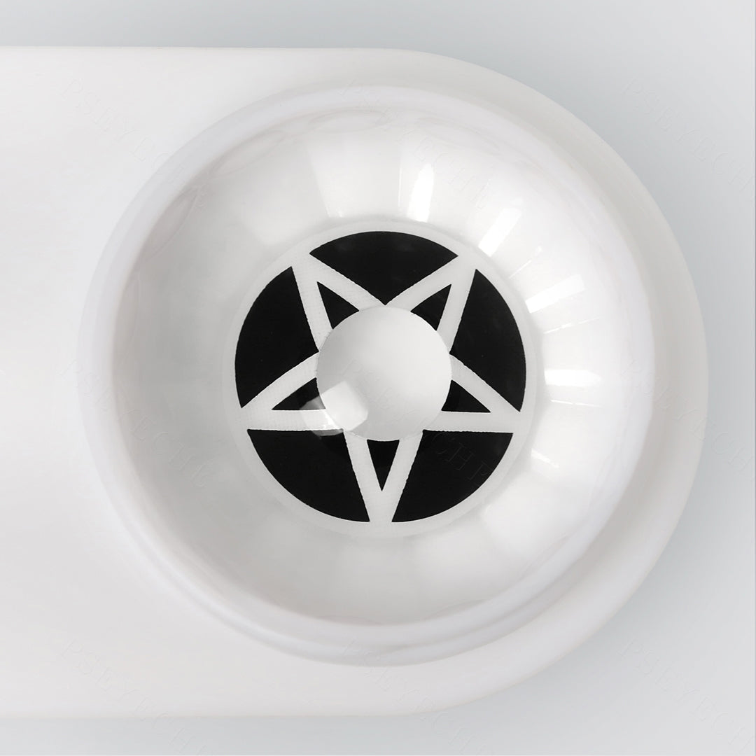 The white pentagram contacts feature a white star and a black background that fully cover your iris. Giving you the perfect pagan witch appearance! Wear these contact lenses at Halloween, with a wicked witch, or an evil sorceress costume, and truly freak out your friends!