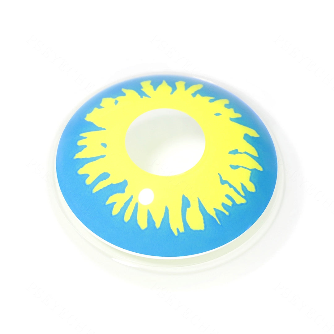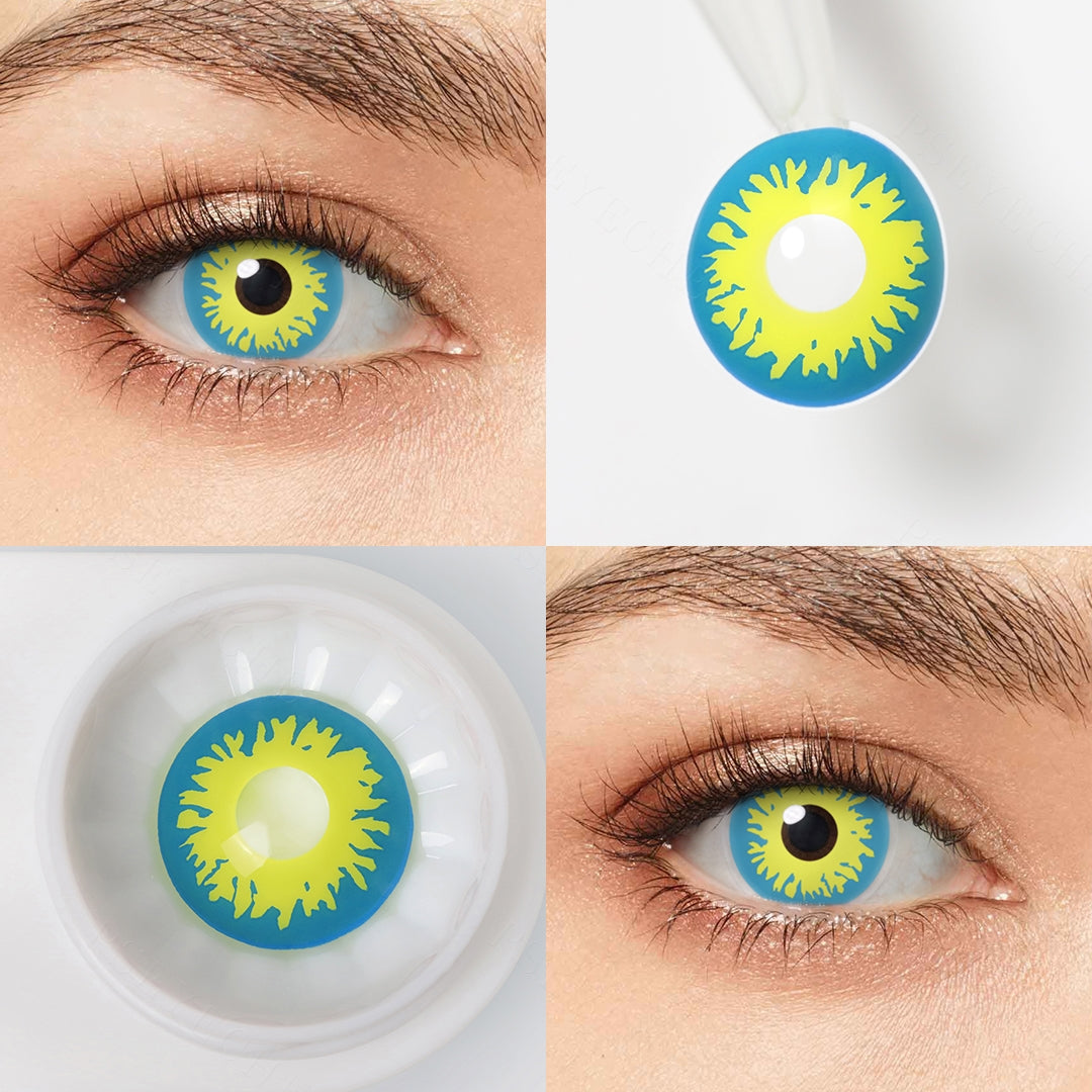 The blue and yellow firework contact lenses are a bright, colorful, wonderful pair of contacts. With a cool blue background and yellow fireworks all around, they'll be the perfect finishing touch to any look. These contacts look great on any eye color and are comfortable to wear all day long. They have a smooth, comfortable fit that is super easy to put in and remove.
