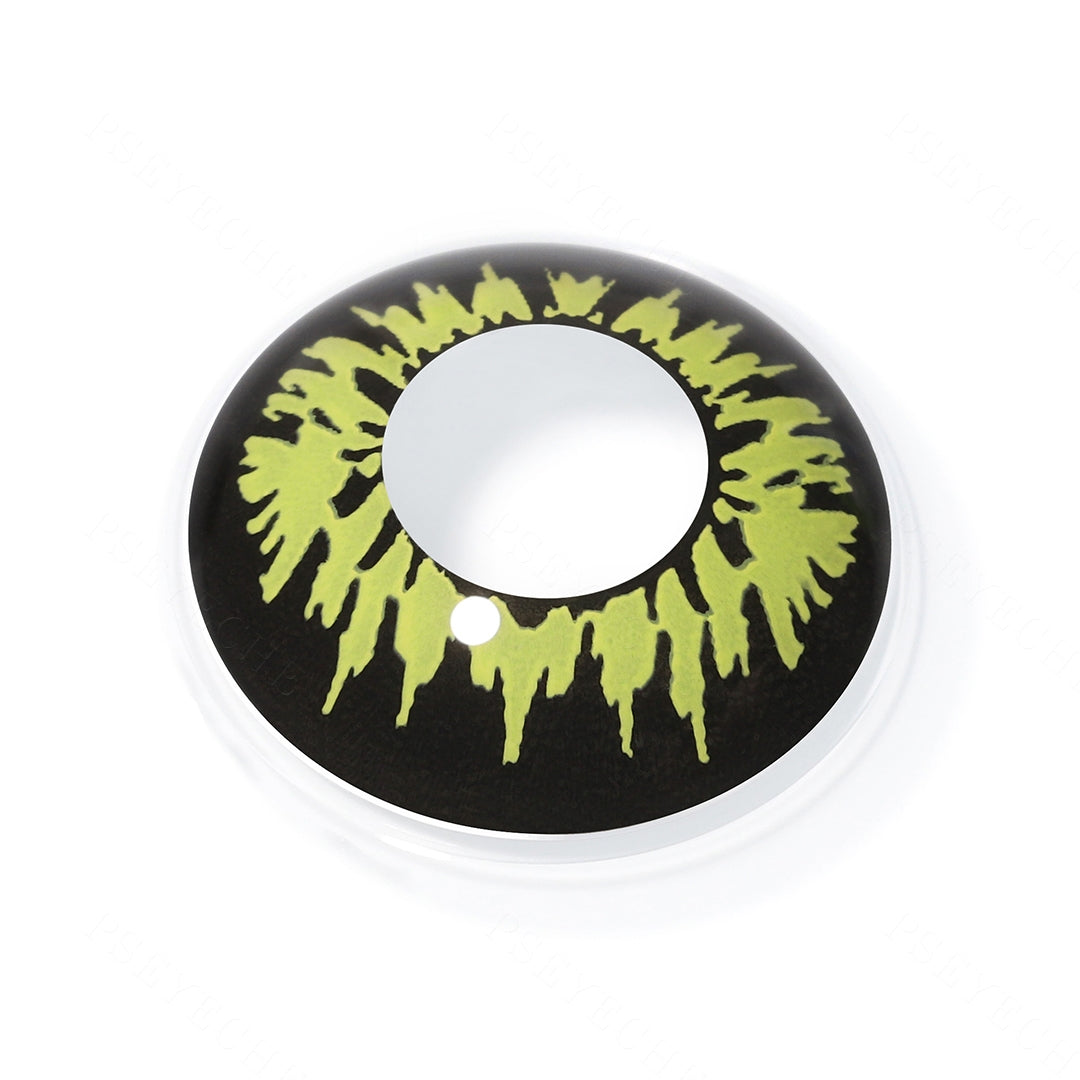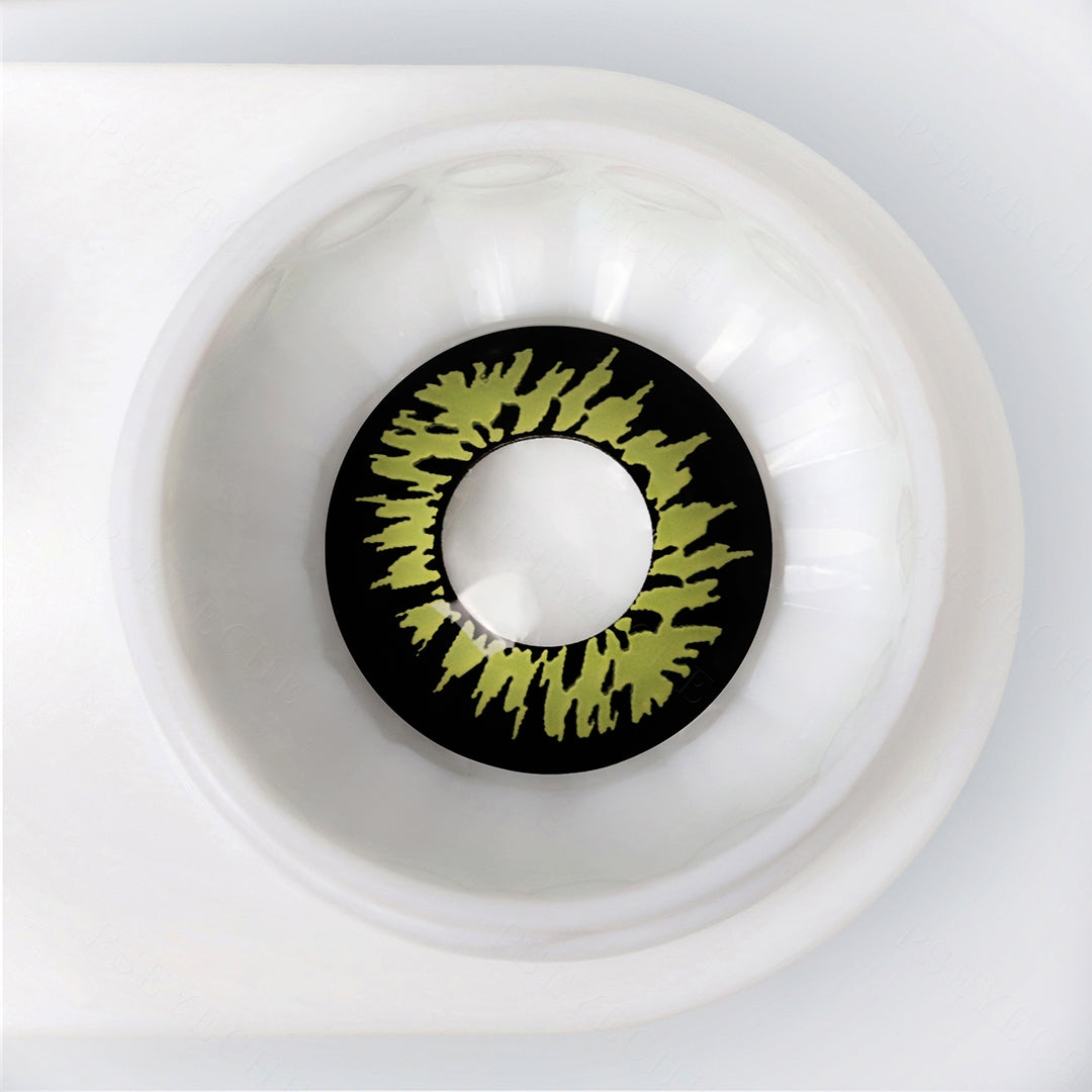 Create hypnotic yellow eyes with these Miracle Yellow And Brown Contacts. These contact lenses have a bright yellow center with dramatic black detailing around the outside of the lens. They look very bold and bright, perfect for Halloween costumes or just making a statement.