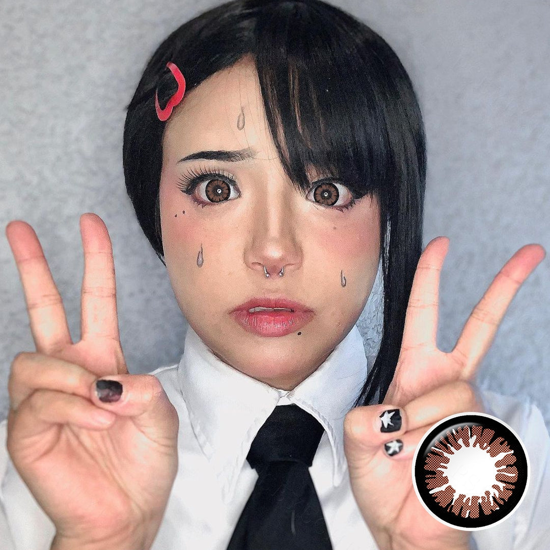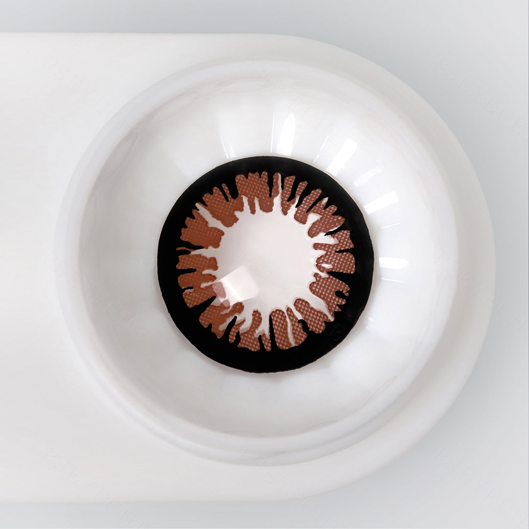 Glamor Brown Contacts provides you with a funky vivid eye look. The dark brown covers your natural colors while the black ragged edge enhances the eye contour. Fantastic for your cosplay.