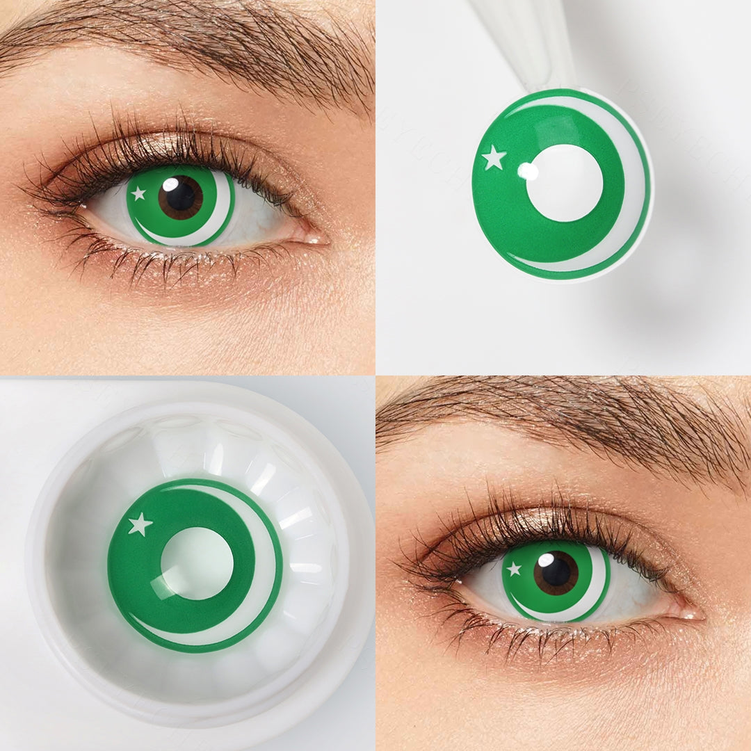 The Pakistani Flag contact lens features bright green colors with a distinctive national flag design. They are perfect for the World Cup, national holidays and even Halloween costumes.