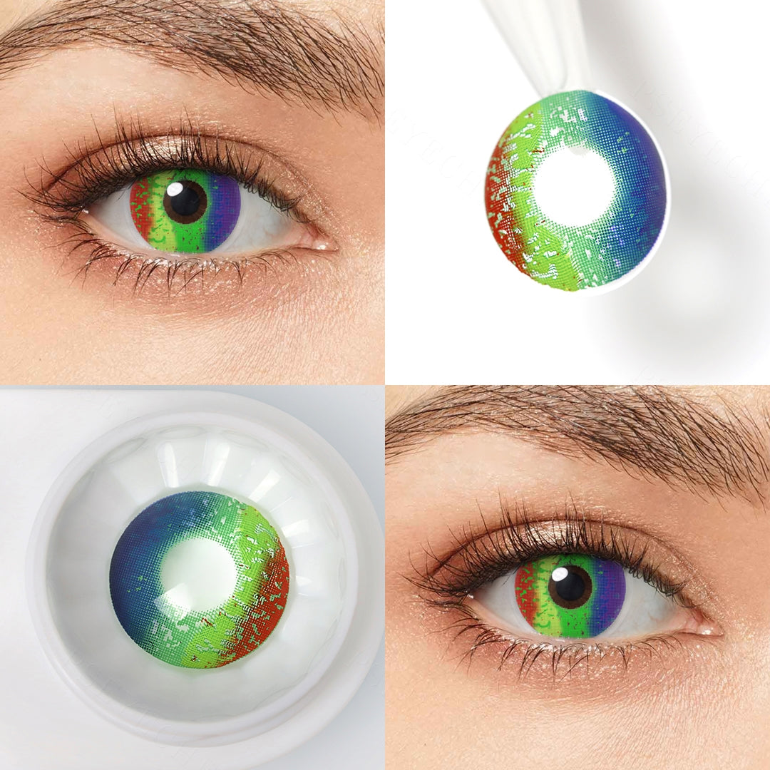 Rainbow Eye Contacts gives you absolutely stunning eyes. These rainbow colored contact lenses are ideal for parties or carnivals and can help you complete a gorgeous outfit. The bright colors of rainbow contacts are sure to give you a bold look to match with your next makeup design or outrageous outfit! Like all of our colored contact lenses, Rainbow contact lenses are FDA approved. The design of individual colors creates a bright, eye-catching look. Suit for Pride, Festivals, Parties and fantasy makeup.