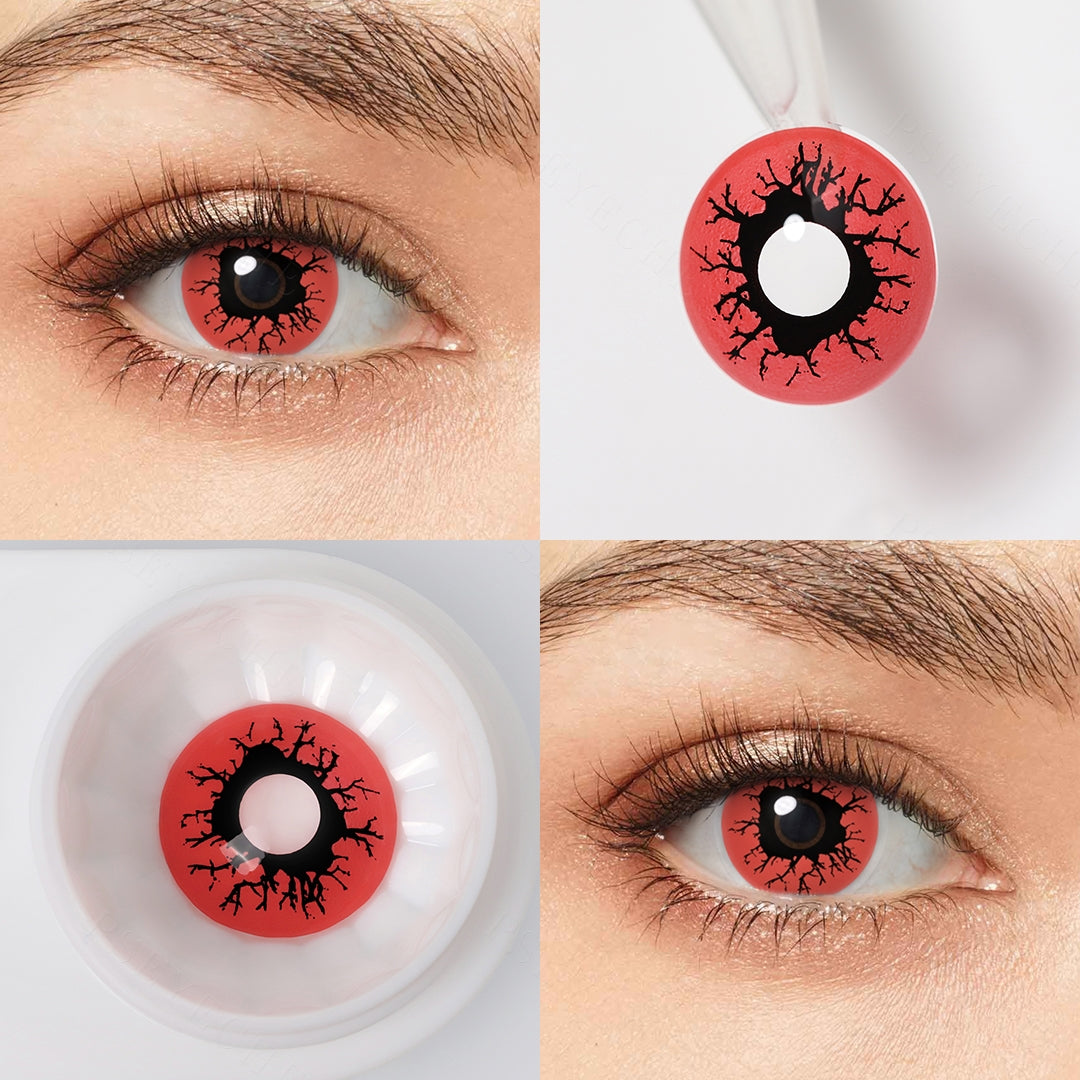 The Red Slipknot lens makes a spooky effect. Cracks around the black hole spread to the surrounding red blood pool. For use for Halloween costumes, and fancy dresses. Get the demon and zombie effect vividly.