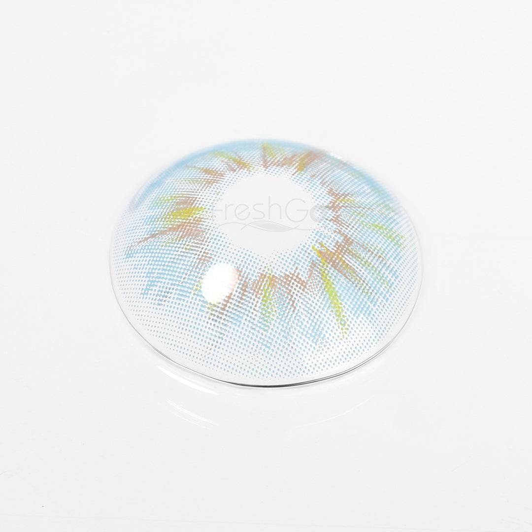 The soft allure blue is as delicate and beautiful as fine crystal, but not too sweet. This easygoing shade is as appealing as your favourite, perfectly bleached blue jeans. Based on allure blue color and added blue and yellow spots, these instantly lighten up your eyes. If you want to have blue eye color, this Allure Blue Colored Contacts must be your first choice.