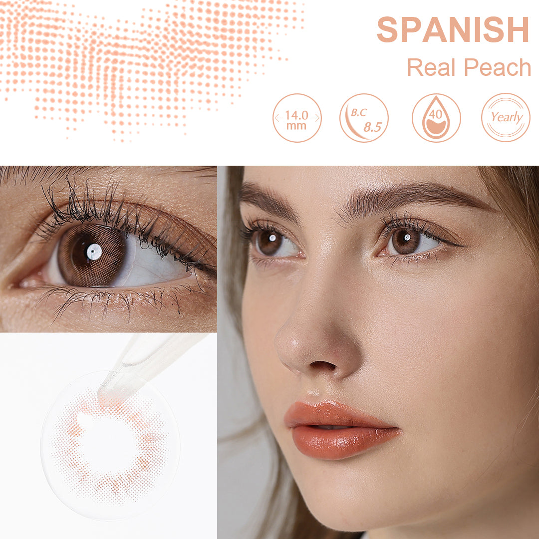 Have a sweetilicious look the same as a peach with our Spanish real peach colored contacts. Spanish real peach contacts feature a purplish color with a tinge of pink. They are perfect for any outing as they are soft and comfortable, it won’t be destroying your party. Recommended to all those people who want to slay any event.