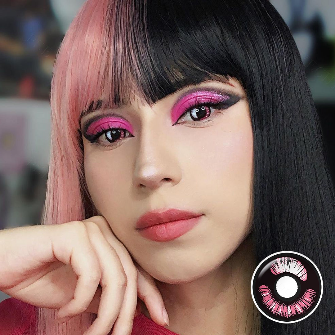 You'll be sweet with this Girly Pink Anime Contacts. Vibrantly pink glowing with a unique design let you stand out at the party. Pick yourself a shin girly lens! The center of the lenses is clear, meaning there are no visual impairments and you can see clearly through them.